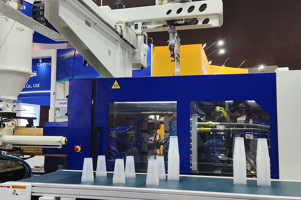 At the show, the Haitian MA3800H/1280PRO injection molding machine demonstrated the production of 1×6 500 ml bubble tea cups. The setup used a custom MFI = 60 PP material developed by Haitian Tongchuang specifically for bubble-tea cups, paired with the Haitian Smart Solutions high-speed, high-rigidity robot VS1100-ID.