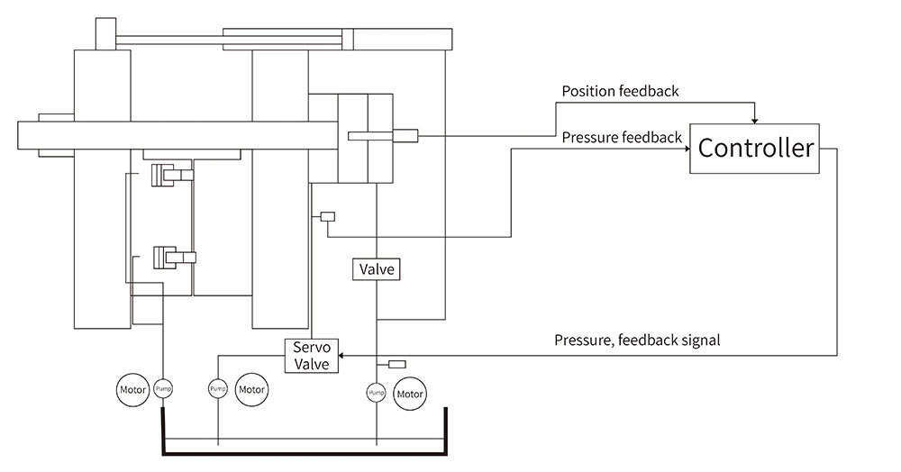 The controller plans the movement curve based on the required process positioning and speed, and reads real-time position data from digital transducers on the tie bar (or mold) and pressure sensor data from the hydraulic system. It then quickly calculates the deviation between the actual and theoretical spatial position of the tie bar (or mold). The controller dynamically adjusts the hydraulic power system and the high-frequency response servo valve system based on the deviation to achieve stability of the mechanism’s spatial state and high-precision positioning of the platen (or mold).